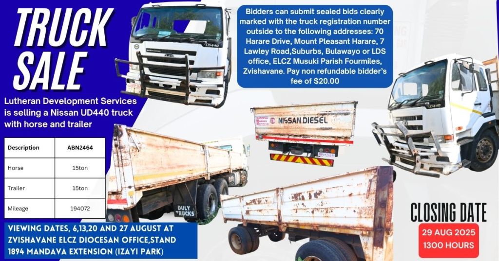 The Lutheran Development Services is selling two Nissan UD440 trucks with horse and trailer. Viewing can be done at Zvishavane ELCZ Diocesan Office, 1894 Mandava Extension (Izayi Park) from 6, 13, 20, and 27 August respectively.